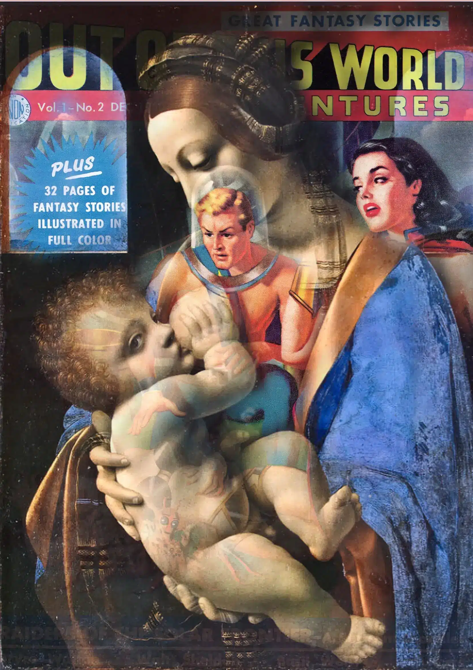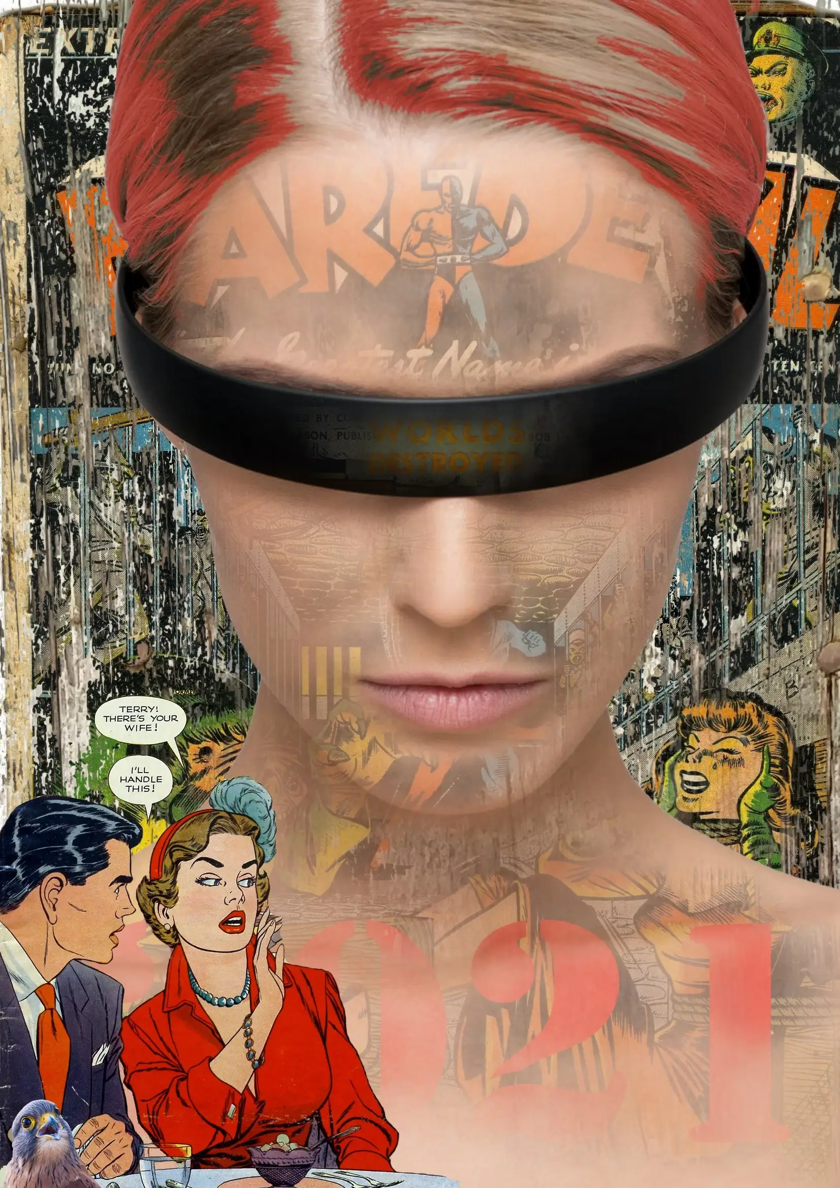 Cette œuvre de mixed media fusionne portrait classique, esthétique punk, et science-fiction pop.