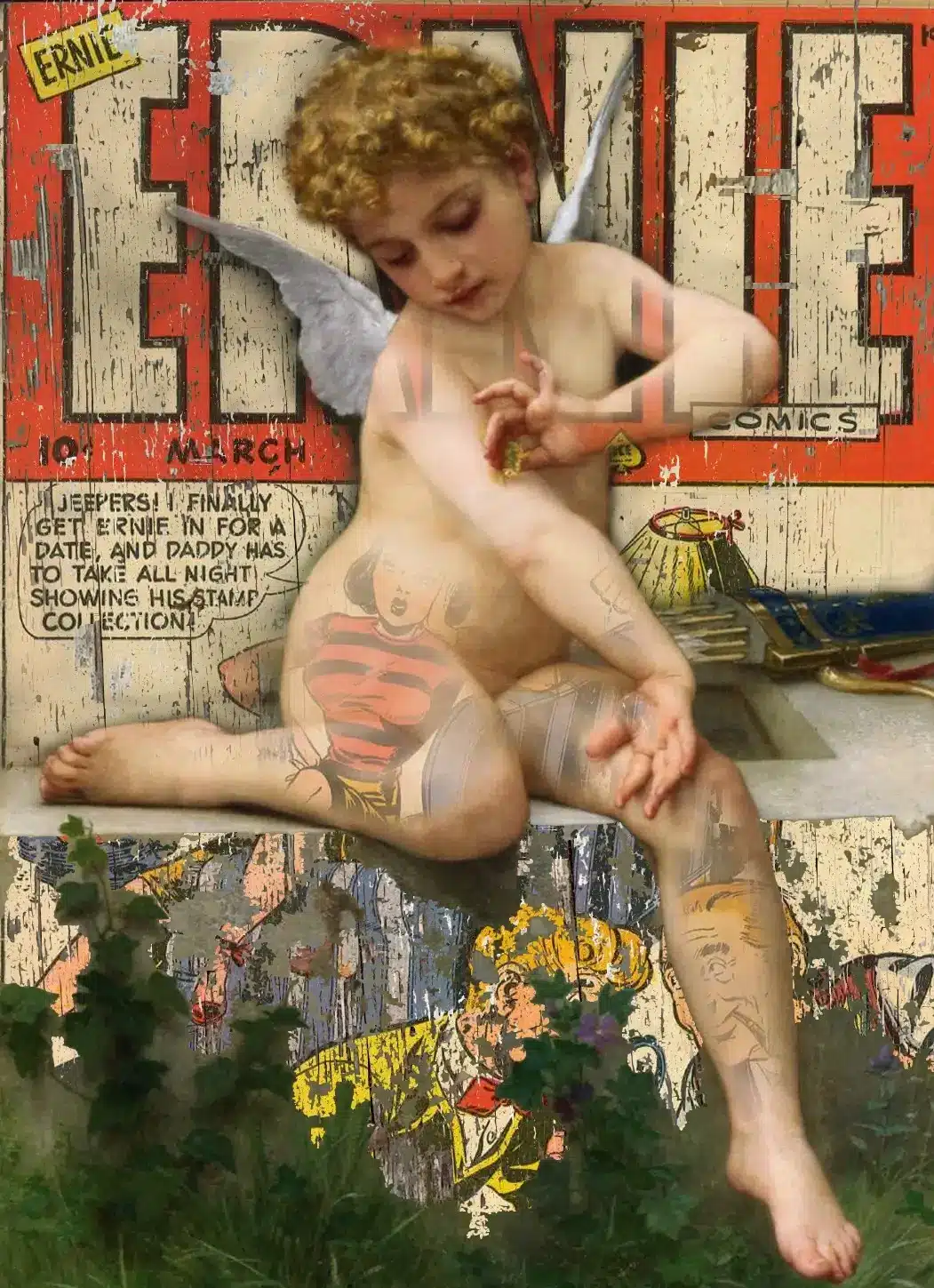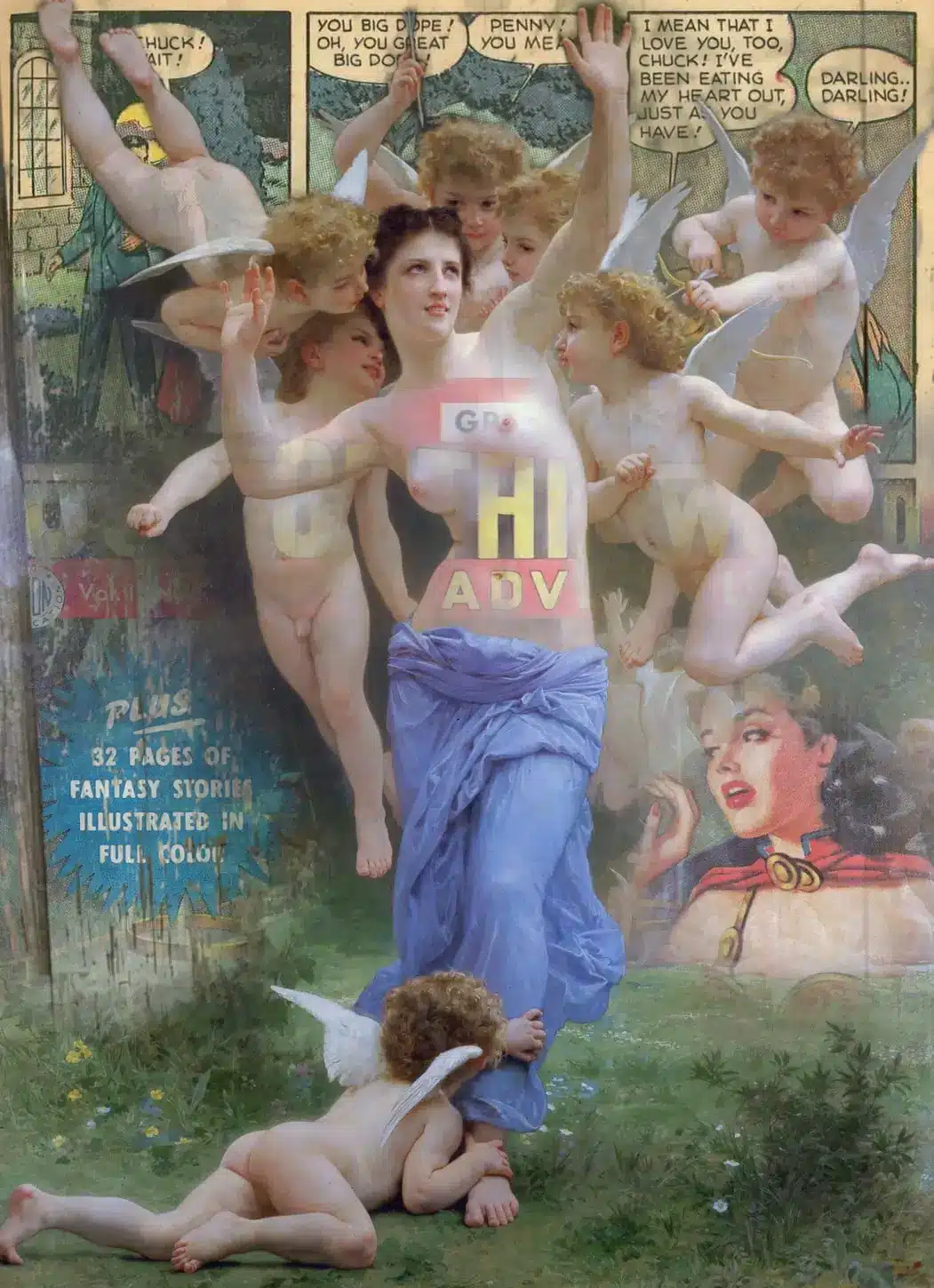 Cette œuvre dynamique mêle culture pop, commentaires humoristiques et motifs surréalistes. 76x105 cm